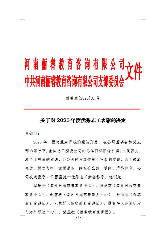2026-01-22关于对2025年度优秀志工表彰的决定...关于对2025年度优秀志工表彰的决定各部门:2025年,面对复杂严峻的经济形势,在公司董事会和党支部的领导下,全体志工围绕公司的总体目标团结拼搏,共同努力,取得了较好的成绩,为公司的发展作出了积极的贡... -